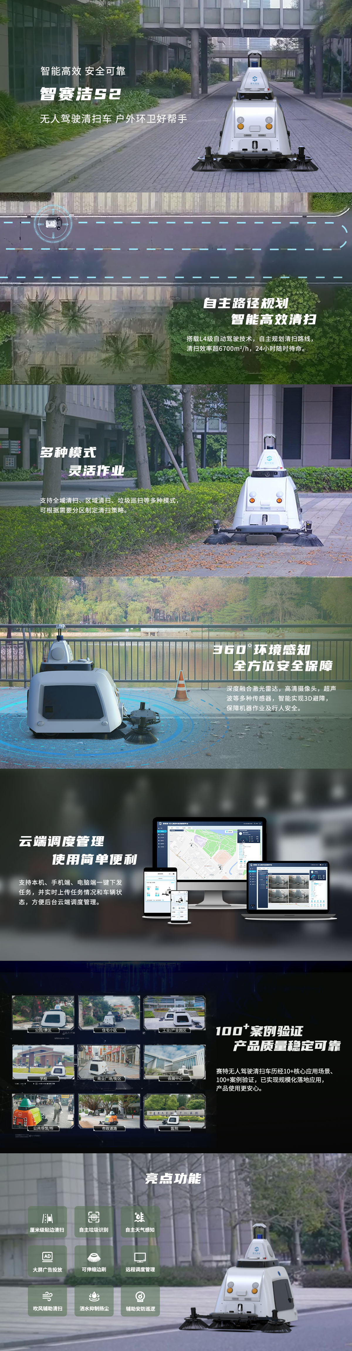 無(wú)人駕駛清掃車S330具備區(qū)域自規(guī)劃清掃、零間隙貼邊清掃、全遍歷清掃等多種作業(yè)模式,結(jié)合自主充電、自主加水、自主倒垃圾等高度智能化功能